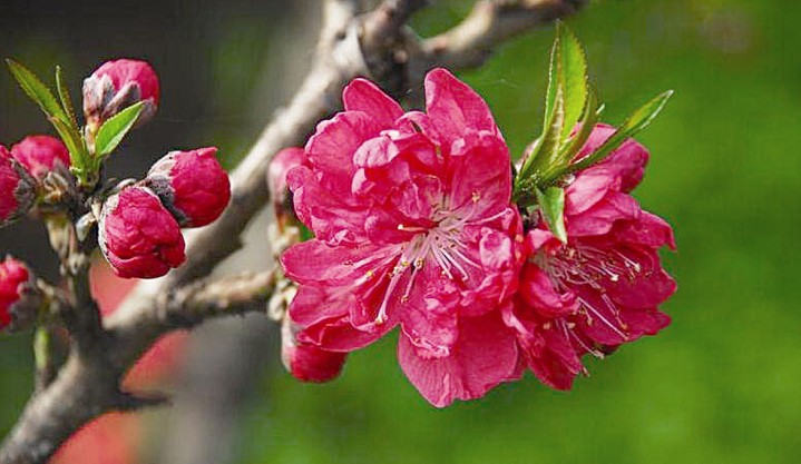 桃花,屬薔薇科,落葉小喬木,高可達6一8米。樹干灰褐色,粗糙有孔。小枝紅褐色或褐綠色,平滑。葉橢圓狀披針形,邊緣有細鋸齒;▎紊邪、粉紅、紅等色,重瓣或半重瓣,花期3月。核果近球形,表面密被短絨毛,因品種不同,果熟6一9月。